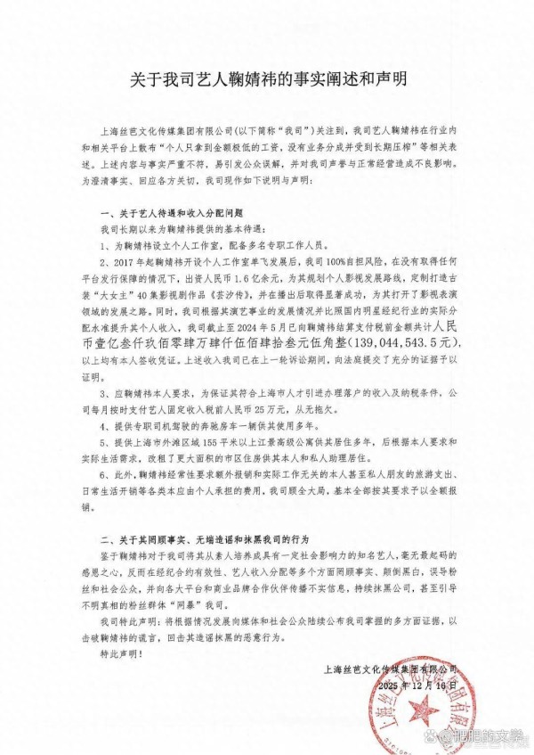 12月16日,丝芭传媒突然甩出重磅声明,直接把鞠婧祎推上热搜——税前1.39亿总收入、每月固定25万工资、上海高级公寓+专职司机,这组数据让网友炸开了锅。要知道,就在前一天鞠婧祎方刚发律师函,控诉公司"长期压榨""伪造签名",双方各执一词的局面,简直比电视剧还刺激!