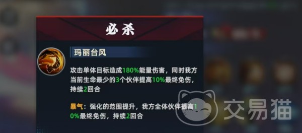 必杀技为单体能量伤害,核心价值在于其免伤增益效果——可为当前生命比例最低的三名友方单位提供10%最终免伤。若在爆气状态下释放,则效果覆盖全体队友,显著增强团队整体承伤韧性,尤其适用于应对高爆发敌人或Boss战中的关键减员节点。