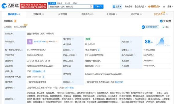 天眼查App显示,Lululemon中国关联公司露露乐蒙贸易(上海)有限公司成立于2013年5月,法定代表人为NG SAN YAN,注册资本1179.2万美元,经营范围包括食品销售、餐饮服务、企业总部管理等。股东信息显示,该公司由LULULEMON HK LTD.全资持股。分支机构信息显示,该公司拥有超160家分支机构。