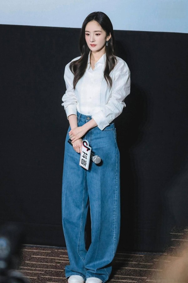 杨幂最近的街拍中,用硬挺的牛仔阔腿裤搭配柔软针织开衫,两种材质的对比让造型立即有了呼吸感。这种”刚柔并济”的搭配思路特别适合日常通勤,既不会太过随意又不失时髦度。