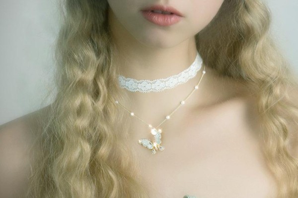 首先,第一种配饰就是choker。choker也被称为锁骨链或者是贴颈项链。如果大家穿一些V领或者是一字肩的lo裙,这个时候就会露出纤细的脖子和性感的锁骨,为了不留白,显得脸长,这个时候脖子上就需要一些配饰。