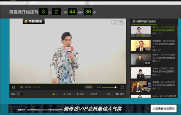 值得一提的是,除了参与设置人气奖,爱奇艺也是此次hito音乐奖的独家直播视频网站。虽然此前已有MAMA音乐盛典、韩国金唱片盛典等直播经验,但爱奇艺本次依然倾情策划和准备,早在4月就通过@爱奇艺liveshow等平台为音乐奖造势,更联合出席嘉宾、入围歌手等录制“抢鲜版”预告视频,引发网友大猜想。