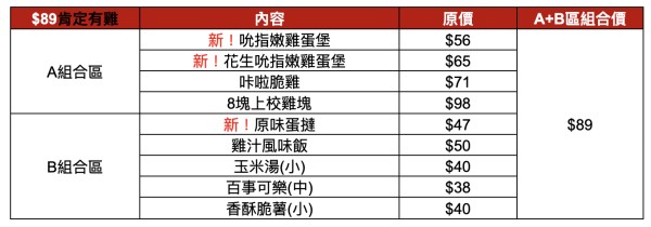 肯德基「$89肯定有雞」A+B組合全新升級!選擇更多樣、怎麼配都有雞!