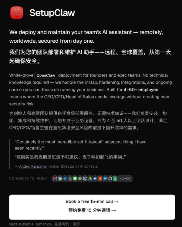 海外更夸张。一个叫SetupClaw的平台直接挂出了价目表:托管安装3000美元,远程配置含Mac mini硬件5000美元,旧金山湾区上门安装6000美元。这是个真实运营的生意,有客户评价,有创业圈大V背书。创始人声称年入百万美元,这个数字有多少水分不好说,但它成功制造了一种叙事:帮人装AI也能财务自由,你不来吗?