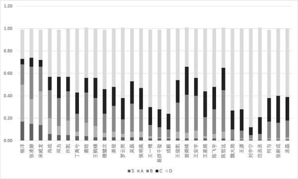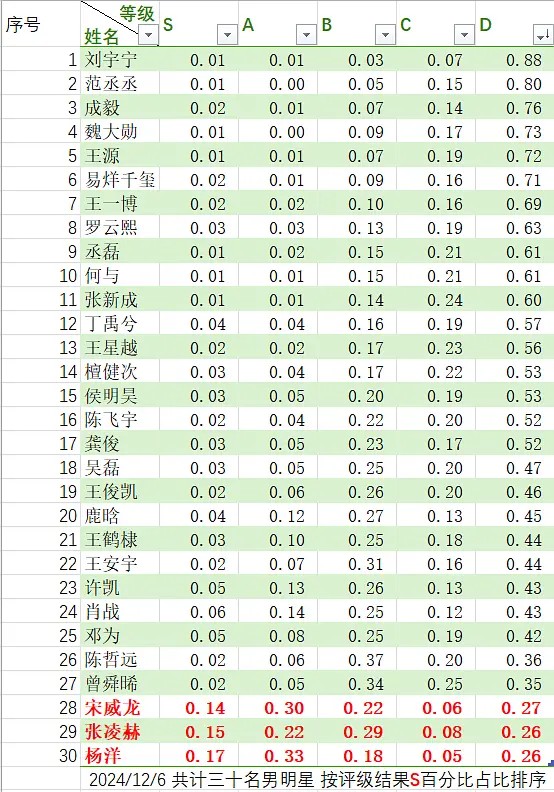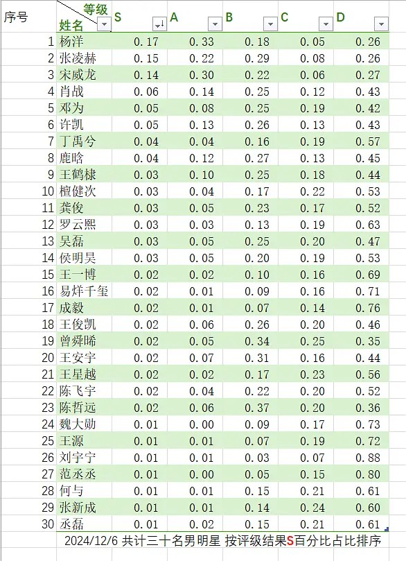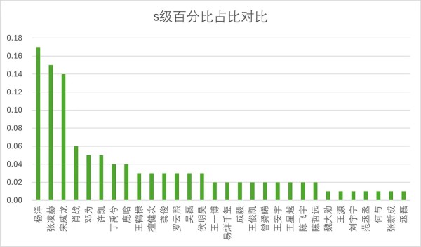 s级占比排名,其中s评级超过10%仅有三位,杨洋(17%)、张凌赫(15%)、宋威龙(14%)