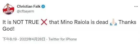 在首个爆出这一死讯的消息之后,《体育图片报》名记,德国人克里斯蒂安-法尔克就通过社交媒体对其进行了辟谣,表示拉伊奥拉并没有去世,即使他在此前已经在社交媒体上为拉伊奥拉的去世进行了哀悼。