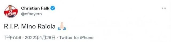 在得知消息还未确认的时候,皇马官方就通过社交媒体对拉伊奥拉的离去进行悼念,表示对拉伊奥拉的去世深表遗憾,而现在看来也是一个大大的乌龙,随后皇马官方又将其删除。