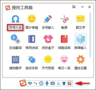 首先切换到搜狗输入法,点击工具栏中最后的【搜狗工具箱】按钮,在弹出的图标中点击【符号大全】。