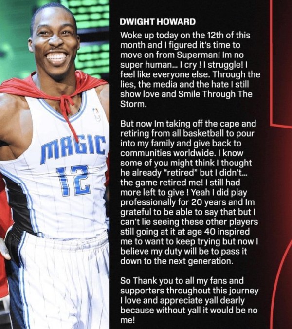 就在今天,3次年度最佳防守球员,8次入选全明星,5届篮板王,一个总冠军戒指。 德怀特·霍华德,这个曾经被认为能“单换勒布朗·詹姆斯”的男人,在40岁这年,用一篇长文告别了篮球。 但最刺眼的一句话,不是感谢,而是:“并非我告别篮球,而是篮球世界向我告别。 ”