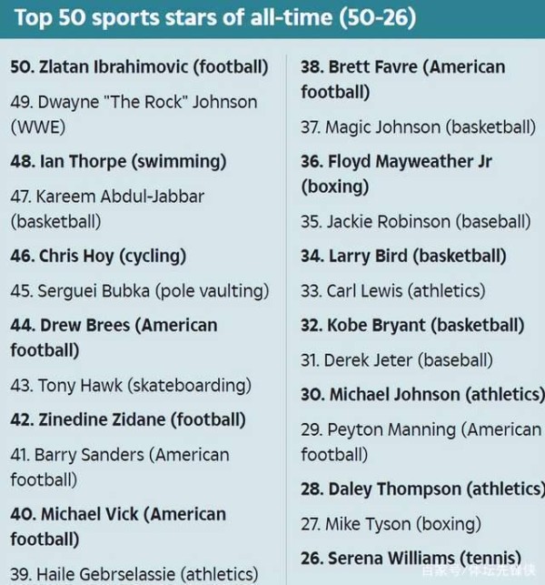 世界体坛50大巨星排行:中国运动员无缘上榜,博尔特仅排在第6!