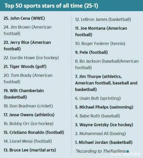体坛界成就最高的十大巨星:伍兹仅第7,博尔特第4,榜首无可超越