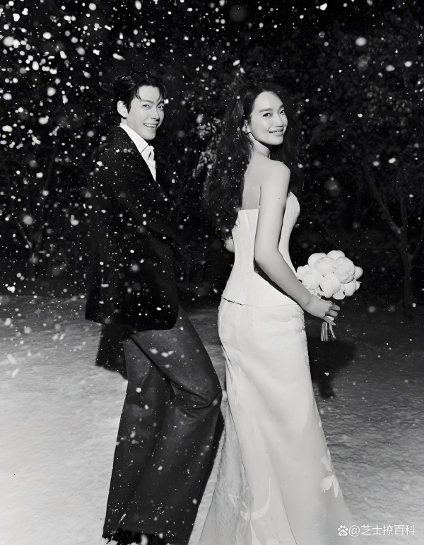婚纱照中的申敏儿身穿简约典雅的Danielle Frankel婚纱,在雪地中手捧鲜花望向镜头,金宇彬则以西装笔挺的优雅姿态站在她身旁