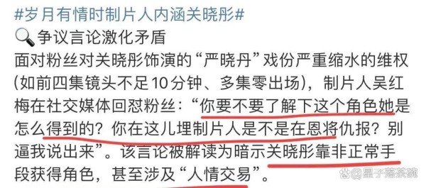 一句看似随意的“你要不要了解这个角色她是怎么得到的?别逼我说出来”,却像一枚小石子,砸进了《岁月有时情》的平静湖面。很快,波纹扩散——从剧评区一路蔓延到全网热搜。原本只是戏份争议,结果拐了弯,变成了对演员关晓彤拿到角色途径的影射。制片人吴红梅的言辞,让这场风波从粉丝质疑戏份和宣发,到指向演员本身,火光四溅。