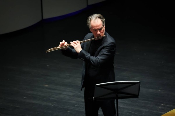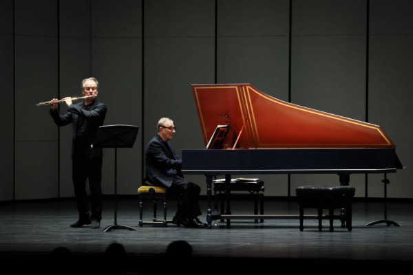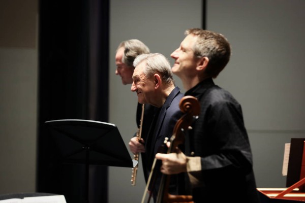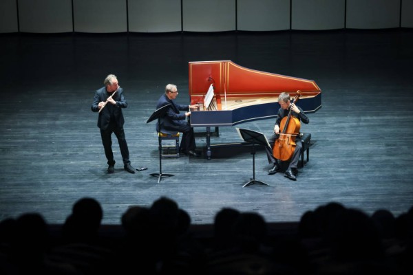 在重奏作品中,三位大师展开默契对话。在巴赫的《E小调奏鸣曲》,《E大调长笛与通奏低音奏鸣曲》中,长笛、大提琴、羽管键琴进行三重奏,三个声部各自独立,又围绕和声框架进行互补与延展,呈现巴洛克音乐典型的织体之美。