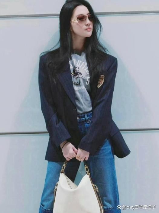 除了这套短夹克搭配,另一套学院风造型更是圈粉无数,也解决了很多女生穿学院风显幼稚的难题。深蓝色竖条纹西装外套,搭配标志性的徽章装饰,单看单品很容易踩雷,自带浓重的学生气,稍有不慎就会显得小家子气、稚嫩刻意。但刘亦菲没有按常规搭配衬衫、百褶裙,而是选择了一件极简灰色T恤做内搭,瞬间弱化了西装的甜腻感与稚嫩感,为整体造型注入了休闲随性的气息,让学院风摆脱了刻板印象,变得大气又高级。