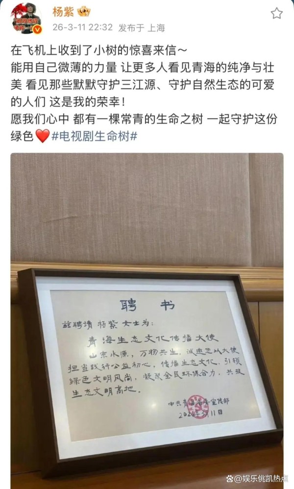 从杨紫的微博来看,作为“青海生态文化传播大使”,她并没有采取“高高在上”的姿态,而是显得格外谦逊与真诚。她提到:“能用自己微薄的力量,让更多人看见青海的纯净与壮美,看见那些默默守护三江源、守护自然生态的可爱的人们,这是我的荣幸!”这句话看似简单,却深深打动了粉丝和网友们。