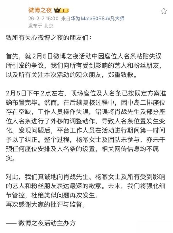 迫于舆论压力,当晚21点22分,微博之夜官方发布道歉声明:“盛典艺人座位和人名条贴纸引发的问题,是在场地下午已布置好的基础上,工作人员复查时粘贴错误”,同时表示已将座位牌改回原位。可这份迟来的道歉,不仅没有平息争议,反而被网友质疑“既然是粘贴错误,为何偏偏只改肖战的座位?为何改动时间卡在临开场前?”有路人直言:“这锅甩得太敷衍,当大家是傻子吗?”