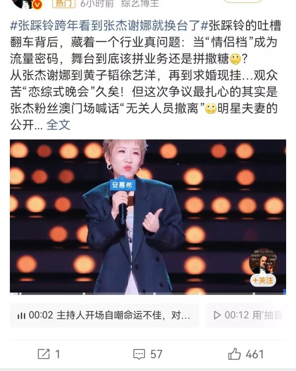 看到张踩铃这股敢说的劲儿,我不禁想起自己每次看跨年晚会的经历,本来满心期待能看到精彩的歌舞表演,结果全程被明星情侣的秀恩爱环节占据,原本的期待一点点被消耗,那种无奈又失望的心情,至今记忆犹新。我始终觉得,张踩铃的可贵,从来不是她的吐槽有多犀利,而是她敢于说出大众想说却不敢说的话,不迎合、不妥协,不畏惧圈层压力,这份直白与勇敢,在当下太过难得。