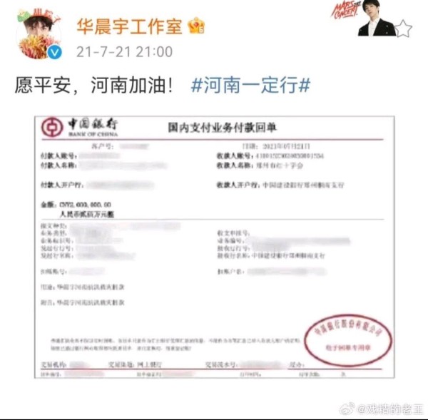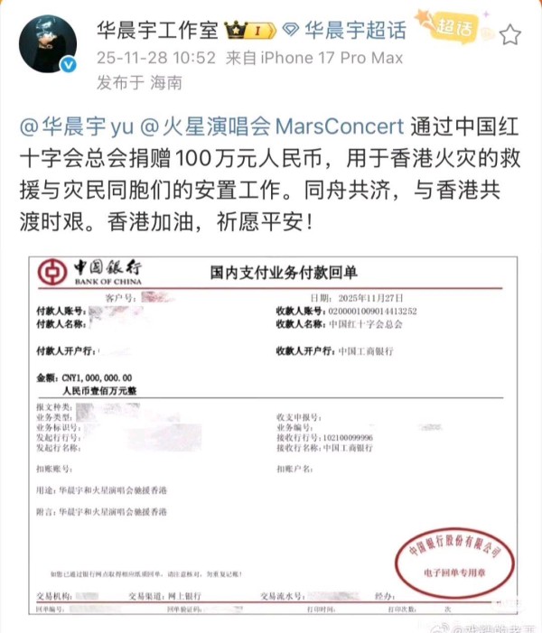 这次援港捐款,华晨宇的速度快到让人佩服。灾情传开后不久,他就通过中国红十字会总会完成转账,100万善款定向用于火灾救援和灾民安置,付款回单清晰明了,没有半点拖泥带水。要知道他刚结束海口火星演唱会收官站,本该休整的间隙,却第一时间对接公益事宜,这份"灾情面前不耽误"的行动力,比任何煽情文案都有说服力。而这早已不是他第一次冲在公益前线,每次有需要,他从来都是"先做事后说话",甚至多番默默付出,连歌迷都要等旁人爆料才知晓。