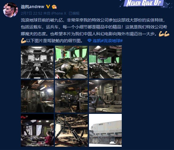 接着再有网友爆料,连凯的特效公司古天乐也是合伙人。了解古天乐的网友都知道古天乐是一个实打实的科幻迷,早在2009年参加《快乐大本营》的时候就说要拍科幻片,而目前古天乐也是主演了科幻片《明日战记》,这部影片预计将会在今年的秋季和大家见面。