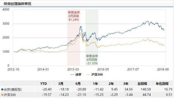 由上图可知,徐彦在担任基金经理期间,其管理的基金(偏股型)业绩年化收益率达到了16.79%,这远高于同期沪深300指数(4669.140, -18.42, -0.39%)(4669.1400, -18.42, -0.39%)的表现。