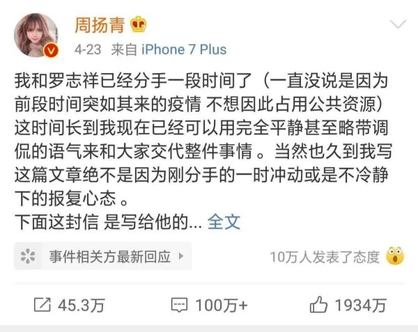 也有人说分手这种事情应该私底下解决,可是作为一个娱乐公众人物,生活会是大众谈资,凭什么可以靠专情吸粉吸金,却被揭露真面目后说应该私底下解决。