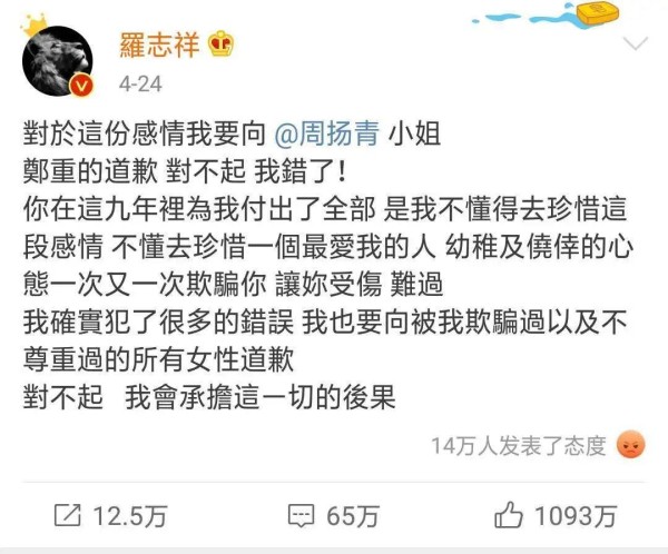 昨天看到一个罗志祥粉丝发的一段微博,意思大概是:怎么能不原谅呢,看着他这些年拿了各种奖项,每次都激动得睡不着觉,这一次犯错了他道歉了,就好像自己的哥哥弟弟犯错了道歉了,能不给个机会吗。
