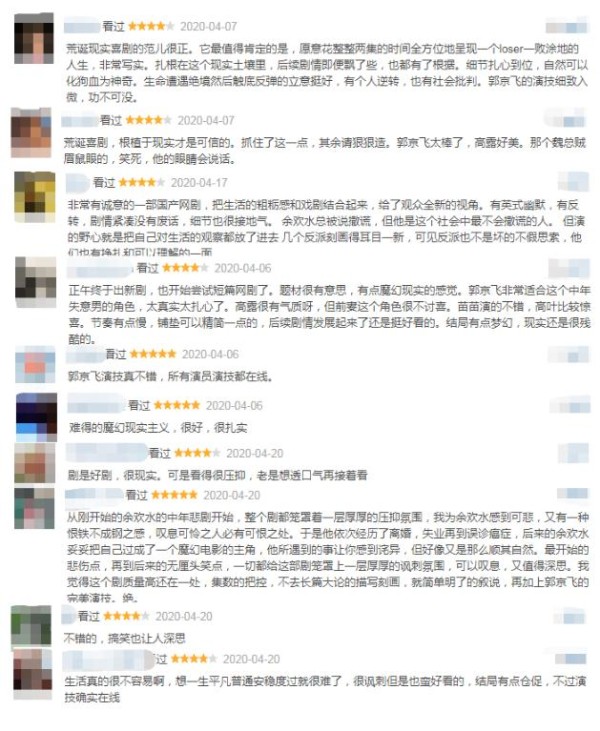 其中大部分网友对该剧给予好评,表示“荒诞现实喜剧的范儿很正。它最值得肯定的是,愿意花整整两集的时间全方位地呈现一个loser一败涂地的人生,非常写实”、 “非常有诚意的一部国产网剧,把生活的粗粝感和戏剧结合起来,给了观众全新的视角。有英式幽默,有反转,剧情紧凑没有废话,细节也很接地气”、“题材很有意思,有点魔幻现实的感觉。郭京飞非常适合这个中年失意男的角色,太真实太扎心了” 、“最开始的悲伤点,再到后来的无厘头笑点,一切都给这部剧笼罩上一层厚厚的讽刺氛围,可以叹息,又值得深思。”
