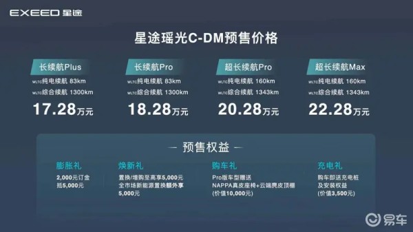 此次预售共四个版本,分别是长续航Plus 17.28 万元、长续航Pro 18.28万元、超长续航Pro 20.28万元、超长续航Max 22.28万元。此外还有赠送真皮座椅+麂皮顶棚、充电桩及安装权益等购车权益。