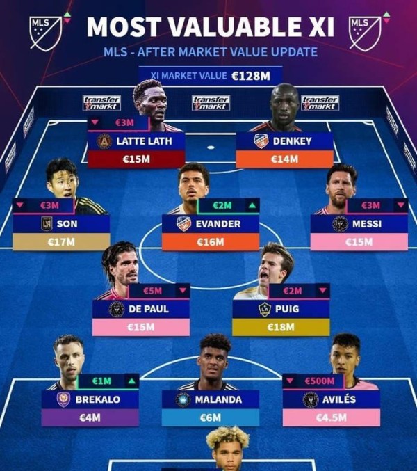 中场五人组则汇聚了身价最高的几位:普伊奇(1800万欧)、德保罗(1500万欧)、梅西(1500万欧)、伊万德(1600万欧)和孙兴慜(1700万欧)。锋线上是辛辛那提的凯文-登凯伊(1400万欧)和亚特兰大联的拉特(1500万欧)。这套阵容的总价值显然不菲,但也从侧面反映出,美职联高价值球员主要集中在中前场。