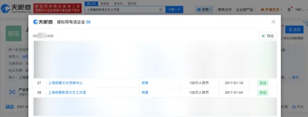 值得注意的是,北京天伊娱乐有限公司与上海杨幂文化工作室共用一个邮箱和电话。此外,迪丽热巴名下上海镜砚影视文化工作室等与杨幂名下上海杨幂文化传媒中心、上海杨幂影视文化工作室年报公示电话相同。