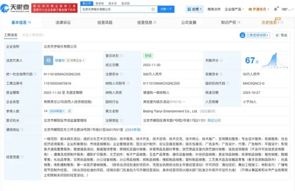 天眼查工商信息显示,天伊娱乐关联北京天伊娱乐有限公司成立于2022年11月,法定代表人为杨春玲,注册资本500万人民币,经营范围包括剧本娱乐活动、组织文化艺术交流活动等。股东信息显示,该公司由杨幂母亲杨春玲、诗摇、共青城尘星及月投资有限公司共同持股。