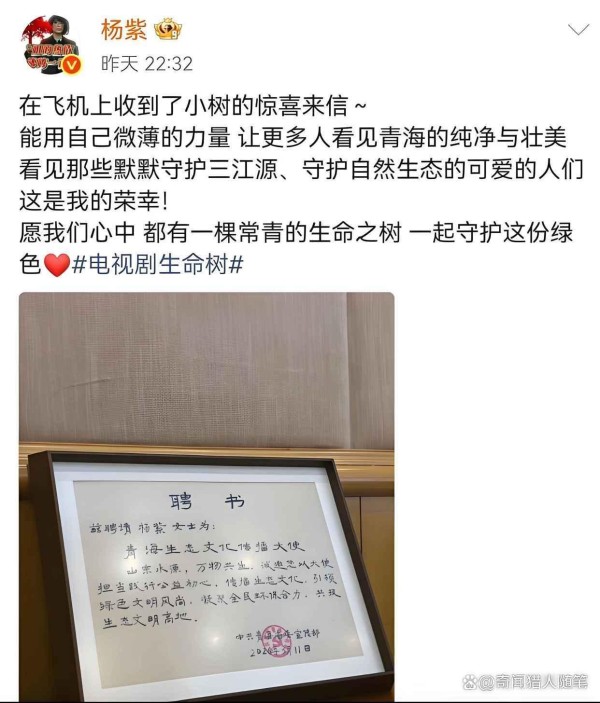 2026年3月11号晚上,杨紫在回北京的飞机上打开一个信封,里面装着青海省委宣传部发来的红头文件,聘请她担任“青海生态文化传播大使”,这份文件的签署日期是前一天,特意选在她刚拍完青海宣传片还在飞机上的时候送过来,她没多写什么,只发了句“手在抖”,这条动态很快就被转了几万次,有人觉得一个演员突然去关注冻土和藏羚羊的事情有点意外。