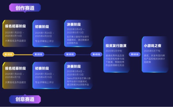 本次大赛参赛者自行命题,湖南卫视、芒果TV的头部音综、模拟经营、推理解谜、派对游戏、互动影视等全系IP,供参赛者创作选择。大赛分为初赛期、决赛期、专场路演、小游戏盛典之夜四个阶段,共设置小游戏创作与创意双赛道。创意赛道报名及初赛期截至2025年4月15日,创作赛道报名及初赛期截至2025年4月22日。 [1]创意赛道,以较低门槛最大程度地激发参赛者,需提交创意方案。若通过初选,需进行DEMO研发。创作赛道更鼓舞成熟开发者,参赛选手须提交不少于10分钟的游戏DEMO。3月4日至5月13日,双赛道优胜作品进入决赛期,DEMO投放至芒果TV平台进行流量测试。最终通过测试数据排行,优选各赛道前5名获奖。5月将举办线下专场路演,让优胜作品团队得以展示,加速优质作品孵化,为行业注入全新势能。更有“小游戏盛典之夜”,盛邀各路游戏同仁,集聚荣耀殿堂,见证属于小游戏创作者们的高光时刻,更有权威发布,签约孵化等,值得期待。 [2]