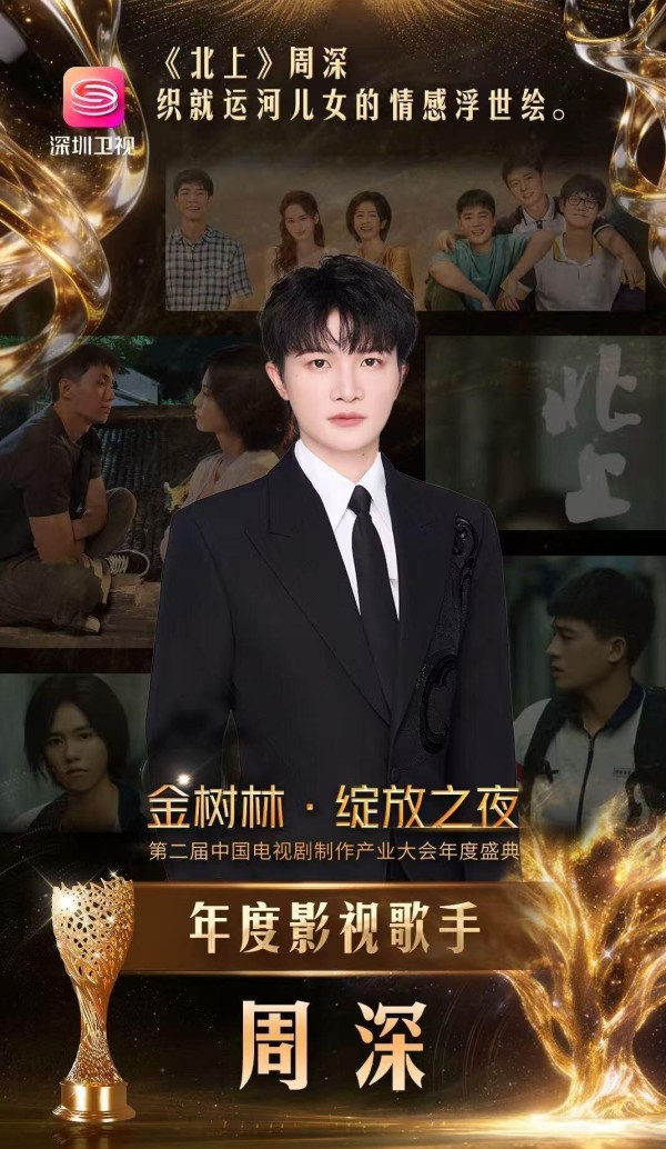 周深是凭电视剧《北上》的片尾曲《消散人潮》拿的奖。 这首歌你们肯定听过,去年火得一塌糊涂。 全网播放量破了15亿,抖音上相关话题播放量超过6亿,微博阅读量4.8亿,长期挂在各大影视金曲榜前面。 很多观众都说,一听这歌,就想起《北上》里运河边的烟火气,那些普通人的离别和重逢、孤独和陪伴,全被周深的声音唱出来了。 有乐评人说他的声音给这部剧“织就了情感浮世绘”,这话一点不夸张。 旋律是辰宿写的词,小柒作的曲,温柔悠长,周深一唱,那种叙事感就出来了,把剧中人物的隐忍、牵挂和成长唱得明明白白。