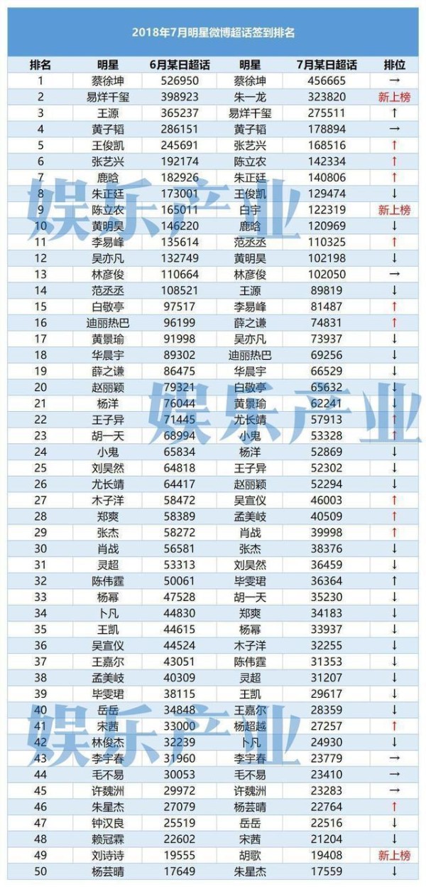 实力派艺人肯定需要时间养成,而流量明星在“四大三小”崛起后似乎进入到了一个相对平稳的阶段。娱乐产业盘点了微博超话签到前50的艺人,发现在6月和7月期间新上榜的只有3位,其中朱一龙和白宇都是由《镇魂》热播而人气迅速蹿升。