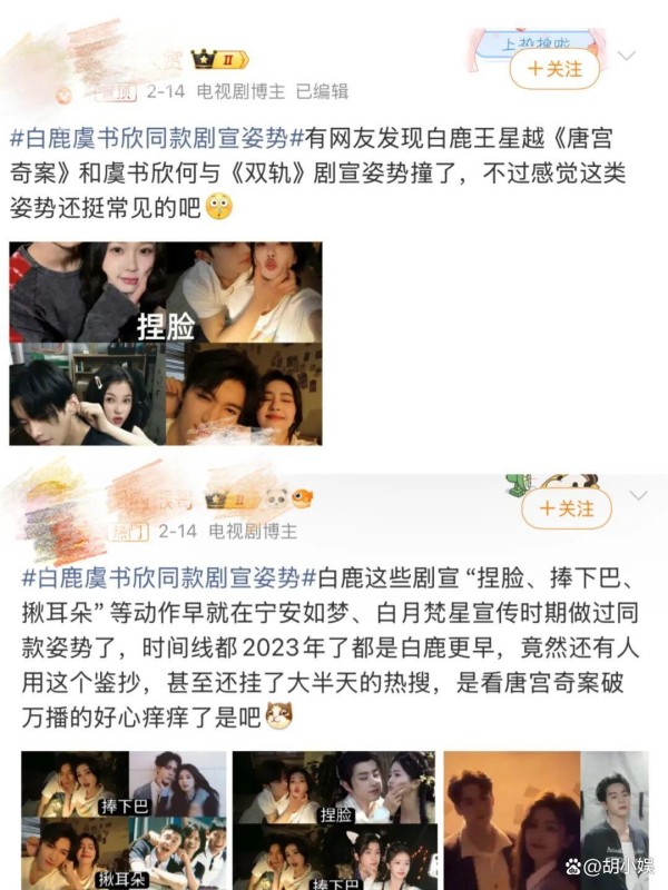 有网友发现,白鹿和王星越在主演的《唐宫奇案》播出期间,为了剧宣而合体拍照的姿势,与之前虞书欣和何与在宣传《双轨》时所拍照片的姿势非常相似。