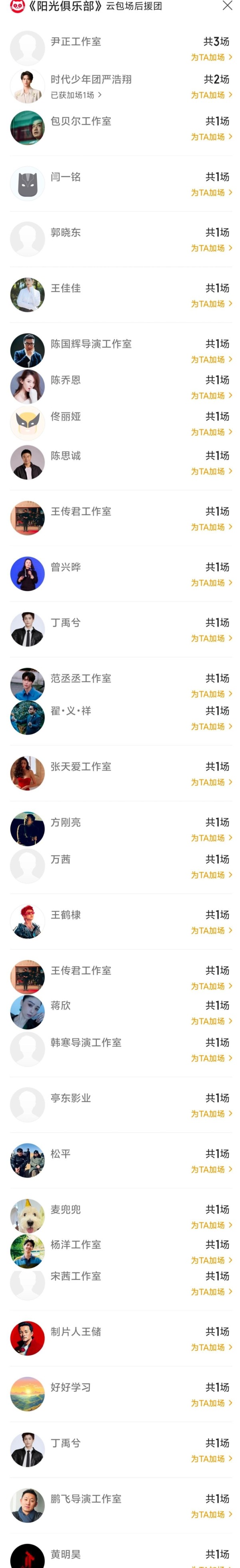相较于线上文案的“口头支持”,线下包场更能体现诚意。 包贝尔的工作室率先公布包场信息:“为晓明哥的《阳光俱乐部》包场10场,邀请团队成员与粉丝共同观影”。 尹正选择在自己的家乡沈阳包场,陈乔恩则将包场与公益结合,邀请当地的留守儿童免费观影。