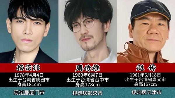8.周传雄:1969年6月7日出生于台湾省台中市,身高178cm,祖籍湖北省荆州市。华语流行乐男歌手、音乐制作人、词曲作者。代表歌曲《我的心太乱》。现定居武汉市。