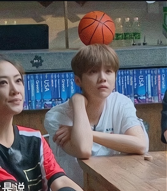 3.这张图看起来就像鹿晗会杂技一样,头顶球。其实是篮球在后边的台阶上,而鹿晗在前边,因为镜头的远近直接拍出了鹿晗顶球的图片。