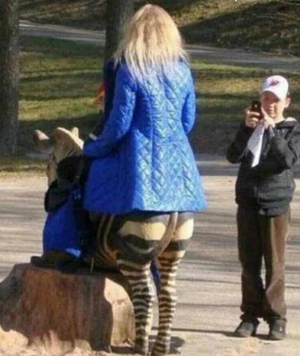 4.一眼看过去好像啊是穿着斑马纹裤子的妈妈在拍照,其实是妈妈坐在斑马上,