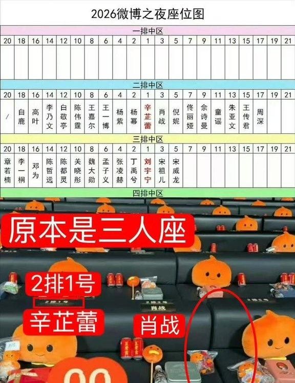 微博之夜座位图体现艺人咖位变化,辛芷蕾坐C位,肖战和杨幂次席