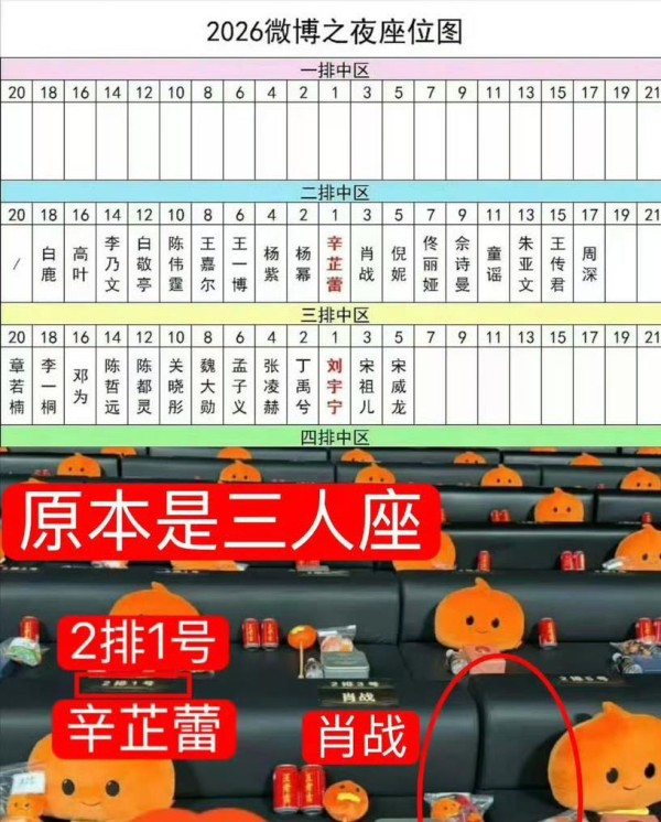 微博之夜座位图体现艺人咖位变化,辛芷蕾坐C位,肖战和杨幂次席