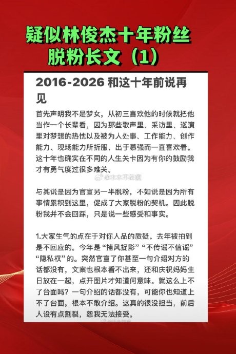 关注明星公开正常恋爱引发粉丝大规模脱粉的现象,本质是粉丝经济中情感投射与商业人设冲突的集中爆发,最典型的案例便是林俊杰、汪苏泷等实力派歌手因恋情曝光遭遇老粉"万字长文脱粉",而路易里美提到的"公开专一的长期恋爱对幻想感破坏力最强",则揭示了这一矛盾的核心逻辑。