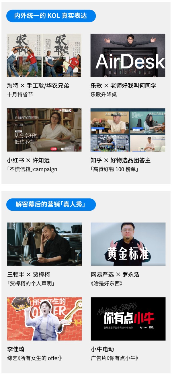 何同学的科技类创意视频、手工耿的脑洞手工制作、华农兄弟的「漂亮」口头禅……上述案例正是基于每个 KOL 的个性特质,与品牌进行内容的结合与延展,用最真实的自己为品牌背书。在这样的真诚态度下,消费者明知是 KOL「恰饭」,仍会表示认可,因为在本质上并没有动摇他们对 KOL 的信任基础。