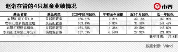 2020年,赵诣管理的四只基金年度回报率分别高达166.57%、163.49%、154.88%和137.52%。