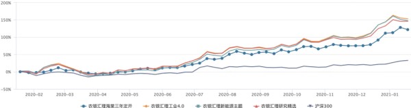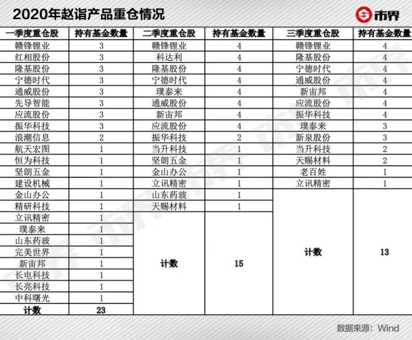 2020年,新能源汽车和光伏概念无疑是A股涨幅最为惊人的板块之一,上游企业赣锋锂业、宁德时代、隆基股份的股价年涨幅分别高达193%、230%和277%。这些股票恰好是赵诣基金产品的重仓股,而且持仓非常集中。