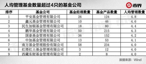 据Wind数据显示,目前全市场有2416名基金经理,基金产品数量为7783只,人均管理数量为3.22只。从基金公司来看,平安基金以人均管理4.8只基金暂列第一,鑫元、民生加银等9家基金公司人均管理基金数量超过4只,在各基金公司中位居前列。