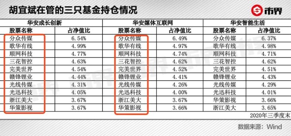 以华安基金胡宜斌为例,他在管的产品有4只,除了一只是科创主题基金外,其余3只混合型基金的前十大重仓股都是分众传媒、歌华有线、顺网科技、三花智控、完美世界、赣锋锂业、光线传媒、光迅科技、浙江美大和华策影视。