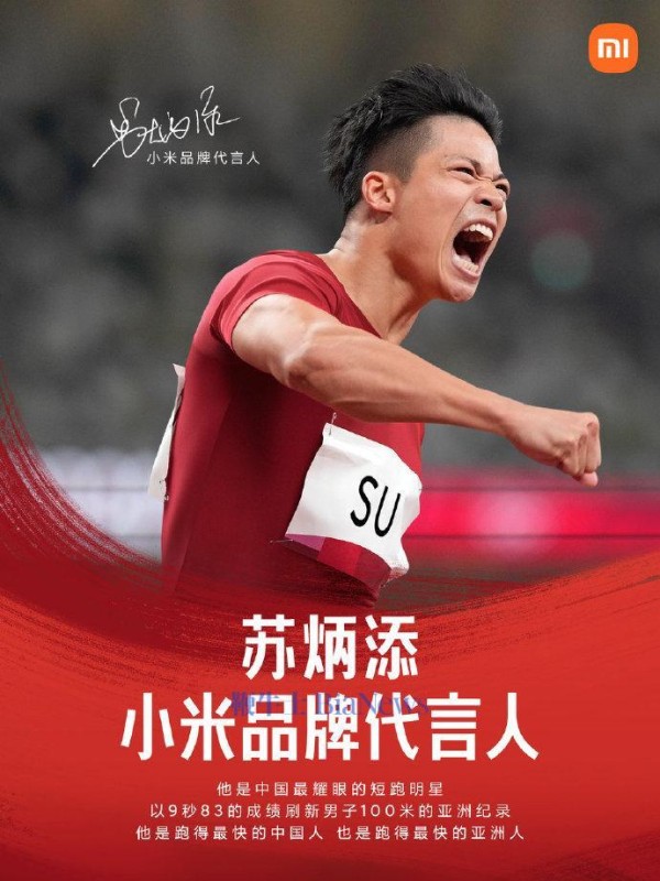 当年8月,在东京奥运会以9秒83刷新亚洲纪录后,苏炳添正式成为小米品牌代言人,这也是小米创业历史上的首个品牌代言人。